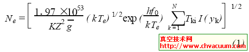 等离子体中存在着大量的带电粒子,它们之有着各种复杂的相互作用,它们所辐射的电磁波具有很广阔的频率范围。如何通过这些辐射得到等离子体的成分(电子密度、电子温度、离子温度、离子密度等) 及其分布是等离子体诊断的一个重要方面。对于黑体来说,不必知道辐射的详细过程,可直接采用普朗克辐射公式来描述各种温度下的辐射谱。但在真空中的等离子体,不是完全吸收体,须考察其具体的辐射过程。辐射过程有轫致辐射和复合辐射两种。轫致辐射就是由作热运动的电子和离子碰撞时电子在库仑场中被加速或减速产生的辐射。复合辐射是通过电子和离子的碰撞使彼此间结合起来而生的辐射。等离子体的连续辐射总强度是由轫致辐射强度和复合辐射强度组成的。在真空开关电弧中,等离子体辐射主要是由轫致辐射决定的,且自由电子的速度远远大于离子速度,韧致辐射主要由电子产生。采用量子力学方法及Abel 变换处理可得到电子密度的表达式 :
