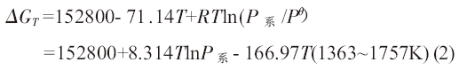 由于反应式(1)所得金属镁为气态,若还原反应在真空条件下进行:在相同温度时式(1)的反应吉布斯自由能降低;或者使式(1)的临界反应温度降低。对于本文所研究的真空系统中,可近似取P 系=PMg,故吉布斯反应自由能与反应温度和镁蒸汽压的关系如式(2):
