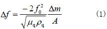 石英晶体微天平(quartz crystal microbalance, QCM)作为微量称量工具,可以测出10-6-10-9克的质量。它具有体积小、灵敏度高、快速、简便等特点,已广泛用于化学、材料、生物、医学、环境监测等领域。石英晶体微天平是基于石英晶体的压电效应对其电极表面的附着质量进行测量的仪器。它的基本工作原理为:石英晶振表面所负着质量的改变引起石英晶振振动频率变化。振动频率随负着质量的改变满足Sauerbrey方程: