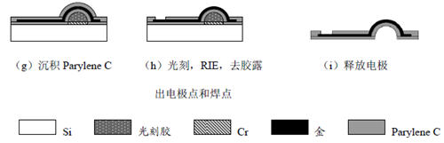 应用光刻胶熔接枝术,经由设计迁移,并应用海洋生物制品相溶性原材料Parylene C 膜包装,再适用Parylene C 的反馈亚铁离子刻蚀展现电级材料点,才能得到了电级材料形貌为半球型的挠性海洋生物制品微电级材料阵列。具体情况的加工制作工艺 具体步骤右图3如图所示。