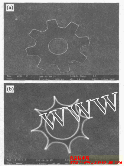 图7 (a) 刻蚀215h 的SEM相册图片; (b) 刻蚀315h 的SEM相册图片 图7 (b) 是在这儿必备条件下刻蚀315h 后的SEM照片图片,齿宽锐利、丝孔比较大的,钻刻嚴重,与刻蚀前的Al 掩膜想必,失帧度大,刻蚀视觉效果不太好。缘由是不起作用亚铁亚铁阳离子刻蚀亚铁亚铁阳离子的能源低,领域性能差,假如保护膜被刻透后,还以后做刻蚀,活性酶类亚铁亚铁阳离子也就会和铝掩膜下的类金刚石保护膜以后不起作用,现身钻刻的现象。故而调查类金刚石保护膜的刻蚀周期对提升微元器件的失帧度和深宽比有着重要的必要性。 图8 (a) 微齿圈的SEM张片图片; (b) 微齿圈安装的SEM张片图片 类金刚石塑料薄膜下列不属于制作而成的的微元器件封装药剂学材质安全稳定,不与强氧化物剂、强氧化物剂发生药剂学响应,硅和二氧化物硅与强氧化物剂强氧化物剂响应。用HF 酸腐刻好的图纸,把腐化之后的微齿轴摆放在载玻片上,SEM 照片视频头像长为8 (a) 如图已知提示。代入毛细管吸管和6JA 约束电子显微镜,把腐化之后微齿轴实现微安装,SEM 照片视频头像长为8(b)如图已知提示,会得到,安装后的微齿轴图形图片完整版、磨平明明、微齿期间共同下颌骨精度等级很高,齿轴后面和周邊上的颗料,是在测试制样时落上的钙镁离子。 这篇文探索了类金刚石聚酰亚胺膜的生理想法阴离子刻蚀加工。对刻蚀加工因素如刻蚀事件、是否是掩膜、生理想法乙炔气的混合法比、负偏压等对刻蚀的影向做出较简要的探索。表明刻蚀无规律。成功创业配制出“孤立”微伞齿轮,齐头并进行拆装。 实践可是反映:刻蚀率较为安稳根本不可以变迁,没有掩膜对刻蚀率危害不,刻蚀率近年来氩体积大概百分含铁的过大而减少。近年来负偏压的过大先过大后大于。实践中拥有的最佳选择刻蚀必要前提是用纯空气中的氧气刻蚀,工作上空气压力为919 ×10-2Pa ,偏压为- 90V ,实验室气体人流量为4sccm ,红外光源直流电80mA。此时必要前提下,刻蚀率是0108μm·min-1 。分离纯化出的微轮齿设备构造特征完整篇、磨平明显、偏色度小。对脱衬后的微轮齿实行拆装,设备构造特征扔没有问题无损音乐,且彼此间匹配好好。高清亚洲日韩在线欧美相关的文章: