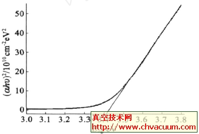 其中A 为常数、hυ为光子能量,α可以通过I =I0exp(-αd) 得到,其中d 为薄膜厚度, I0 、I分别为入射光和透射光强度, I/I0是透射率。(αhυ) 2与hυ的关系曲线如图5 所示:光学禁带宽度Eog值通过延长图中直线部分至hυ轴(αhυ=0 ) 得到,从图5中可以看出,ZMO薄膜的光禁带宽度Eog约为3.41eV 。这比室温下ZnO薄膜的禁带宽度(3.37eV)要大,这是导带的最低能级被过量的带电载流子占满所引起的,即Burstein2Moss位移效应 。