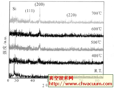 1 Si 片上积累的NiO pet薄膜在不一固溶处理体温下的XRD图谱