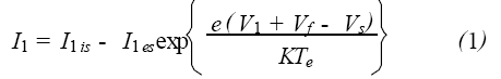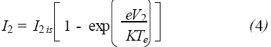 I2is是探针2的饱和离子电流, V2 是探针2 相对于Vf 的电位。由于双探针电路相对于等离子体处于“悬浮”状态,流入一个探针的电流与流出另一个探针的电流相等,所以I ≡I1 = - I2 。