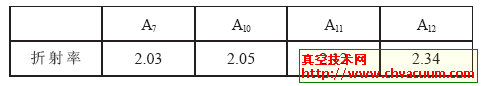 由表2看出,随着热处理温度的升高,薄膜折射率也逐渐增大。分析原因:因为锐钛矿折射率为2.56, 金红石更致密,折射率为2.77。样品A7、A10是无定形结构; 样品A11 在400℃热处理下已经出现锐钛矿结构; A12在850℃热处理下出现了金红石结构,是锐钛矿和金红石的混合态,所以折射率最高。由此看出,可以通过热处理的方式,在适当的范围内来改变氧化钛薄膜中锐钛矿和金红石两种结构的比例,改变薄膜的折射率,从而达到微调氧化钛薄膜光学性质的目的。