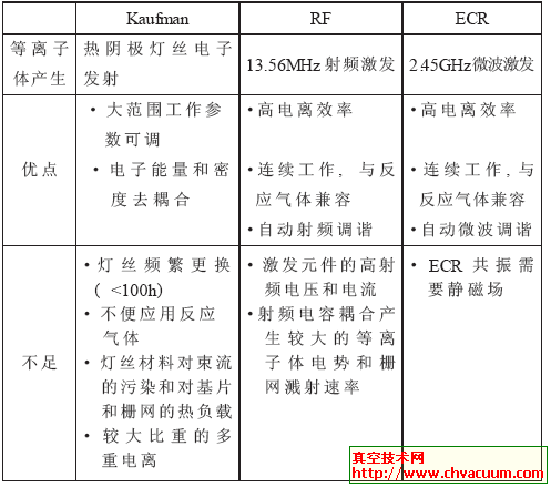 表1对以上讨论的离子源进行了比较。可以看出, 灯丝寿命短、稳定性差、污染及其与反应气体兼容性差是Kaufman离子源的缺点,RF和ECR离子源解决了这些问题,虽然在反应气体工作时也会在放电室内部和栅网上产生碳氟沉积,但可以在工作间隙通入氧气或者一氧化碳等“清洗气体”(cleaning gas)加以去除。