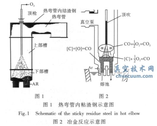 RH 真空炉是生产超低碳钢的关键设备,对改善产品结构、提升产品档次起着至关重要的作用。宏发炼钢厂转炉二车间两座180t RH 真空炉是由西门子奥钢联SIEMENS- VAI 公司总体设计,在热调试三个月后就进行超低碳钢的大批量生产,在生产的过程中,无论是设备参数还是实践操作都暴露出了问题,尤其是在冶炼超低碳钢真空脱碳过程喷溅导致的一些问题严重制约生产。比如,喷溅的渣钢将摄像孔粘死,操作人员看不到真空槽内冶金反应,顶枪孔粘渣钢使顶枪升降受阻,难以进行吹氧作业,枪头积渣导致氧枪点火困难,热弯管内积聚渣钢多影响抽气功能和脱碳效果,导致热弯管更换频繁。真空炉粘渣钢部位见图1 所示。根据上述情况,详细地分析了脱碳过程喷溅的机理,结合生产实践,提出了相应的控制措施,解决了真空炉脱碳过程中喷溅的技术难题。