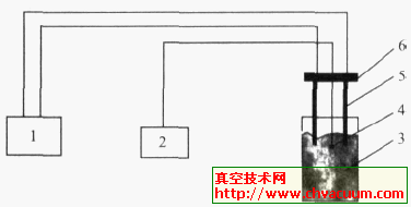 1. 电阻指示仪2.温度指示仪3. 物料4. 热电偶5. 不锈钢电极6. 夹紧装置