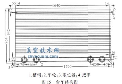 物料温度为- 40℃,结冰的物料装在托盘里,放在台车的架子上(图15),存放在冷冻室内,在8 h 内,往冷冻室装满56 托盘120 kg 被冻结的原料(物料由屠宰场分批供给)。冷冻室内的温度约为- 30℃。冷冻室与干燥室通过断面为700×1000 mm2 的真空闸板阀相联。台车装满盘子后,可打开阀门将台车推进干燥室,沿斜坡到达干燥室端盖缓冲器的挡板处。台车进入后与末端开关相碰,自动关闭真空阀门。同时端盖密封。干燥室经过一个真空阀门(内径500mm)与对应的升华凝结器相连。而升华凝结器由真空主管道(内径80 mm)与三台BH- 1Г 型机械真空泵相连,构成预真空系统。在干燥周期内,只利用一台真空泵工作。