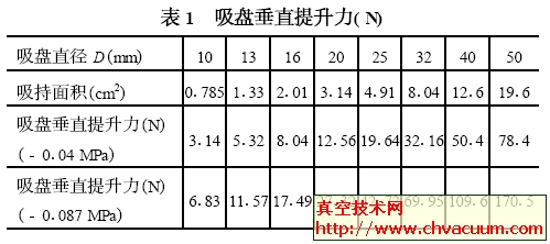 吸盘网套直径(mm) :10、13、16、20、25、32、40、50 共分8档;实用真空系统运转气压: - 0.04~0.087 MPa ;吸盘斜面提高了力理论知识值见表1。4、平直型真空吸盘的选型及其注意事项