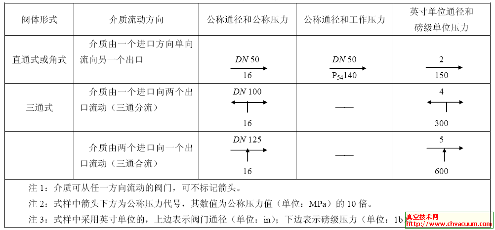 公称通径数值标注、压力代号或工作压力代号、流向标志,应按表1 规定的组合样式,公称通径数值标注在压力代号上方。