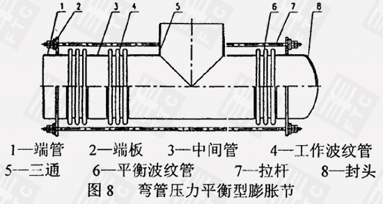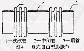 由一或中间的管所连到的两大岗位波浪纹管和一均衡性波浪纹管及弯头价格或三通管件、封头、拉杠和端板等型式件组成了、主要的使用在消化吸收心轴与垂直组合式位移并能背负波浪纹管水压扭力的澎涨节(见图8)。