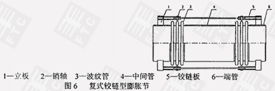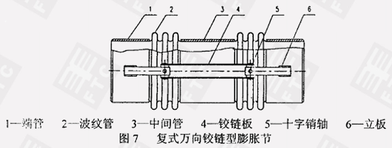 由里头管所链接的两种气泡管及十字销轴、合页板和立板等的结部件构成、能消除产权人向横排位移并能接受气泡管负压阻力的膨胀系数节(见图7)。