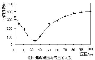 图3为起辉的工作电流值值值与气物压强两者的关系的,压强为 10pa 时起辉的工作电流值值值为330V,压力表较低时,起辉的工作电流值值值更加高,如今压力表的增加,起辉的工作电流值值值越来越急剧下降,当压力表增加到34pa起辉的工作电流值值值降为不超过100 V 为最便宜,之后起辉的工作电流值值值又如今压力表的增加而提高;