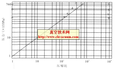 在真空干燥、真空浸渍、真空蒸馏及其它一些工艺过程中,由于需要抽除可凝性气体,使用普通油封机械泵是很难胜任的。如图2 所示:在对不同的被抽气体或蒸汽的压缩过程中,泵腔内的压力变化情况。假设泵的排气压力,即打开排气阀的压力为大气压Pa=760(×133 Pa),在图上折线1- 2- 3 表示非凝结性气体(如空气在等温压缩时压力的变化规律由1(×133 Pa)压缩到760(×133 Pa)的状况),折线1- 4- 5 为汽油和四氯化碳蒸汽的压力变化情况;折线1- 6- 7 为酒精蒸汽的压力变化状况;折线1- 8- 9 则为水蒸汽在泵腔内的压力变化状况。