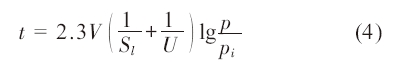 由上式(3)可知,管路两端的最大压差与真空泵的抽速无关。因此,为减小长管路内的压力差,应减小长度L,但本工程中L 为定值,不能变。在本工程中,要求长管路内的真空度为100 Pa,视为低真空常速抽气。因此,其抽气时间按下式估算[3],流导为U 时1/S= 1/Sf+1/U则