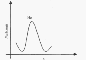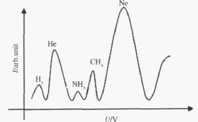 式中,R为离子偏转轨道半径;B为磁场强度;M/Z为离子的质量与电荷之比;U为离子的加速电压。由此可见,当R,B为固定值时,改变加速电压,可使不同质量的离子通过磁场和接收缝到达接收极而被检测到。如果电离室内的成分是干燥大气,在图1的出口缝处测得的离子流强度的理论峰值如图2(根据干燥大气成分绘制)所示,图中峰值的高度代表离子流强度,它与气体在电离室的分压成正比;氦质谱检漏仪就是利用这一原理,实际上把加速电压设在氦峰值上,如图3所示,接收极在挡板的作用下只能接收到氦离子,氦离子电流经过放大后用作指示漏率。