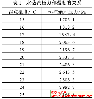 在露点温度时, 空气中水蒸汽的蒸发和凝结达到了平衡, 在压力变化检漏中, 通过露点传感器测量露点温度, 就可以得到水蒸汽的分压力, 表1 中是常压、常温状态下不同露点的水蒸汽压力。1 ℃的露点温度引起的被检件中的压力变化约几百帕 。