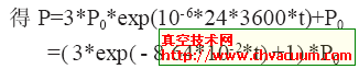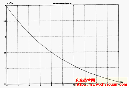 粮食真空干燥行业要求容器总漏率η的数量级为10Pa·m3/s,假设真空仓工作于8000Pa 状态, 代入⑤式δ的数量级为10- 4Pa·m3/s; 对于100m3 的容积, 取κ=10- 6/100*103=10-6,若检漏时充入3 个大气压力, 则压力随时间变化的公式如下: