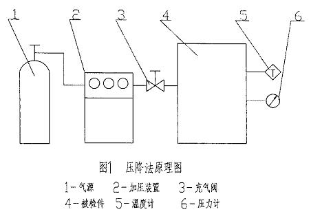 2.1、的定义 压降检漏法是被检件中内充标准相关规定心理压差的废气后,在标准相关规定测试图片仪用时内 测试图片心理压差的变化规律,计算出来出漏率的措施。最大可检漏率与被检件的保压用时、里面的合理有效容积怎么算和测试图片仪机 光于。 2.2、原因 将被检件內部内充特定各种重压的有害气体,使被检件上下出现明文规定标准的各种重压差。经历尽量的稳定性时刻后,在明文规定标准的测式周期公式内按特定的时刻接连读入被检件內部的各种重压和温暖,经算起的被检件的漏率,机理图见图1。 2.3、计算工式 2.3.1、压降检漏的漏率常见按式1 对其进行确定Q=V/t ×(P1- T1/T2 ·P2)...............(1)
