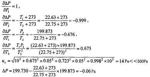 3.3.2、测试图片设备不判别度计算方法根据型号检漏某次的测试值,得到压力初值P1为199.730kPa,温度初值T1为22.63℃,压为终值P2为199. 873kPa, 温度终值T2为22.75℃, μp1 = u p2=10Pa, μT1 = μT2=0.05℃,则得到: