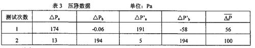 根据以上数据,分别计算了理想状态下的压降值△Pa、△Pb,除去水蒸气分压后的压降值△P'a 、△P'b及两点温度平均后的压降值△ P,数据见表3。