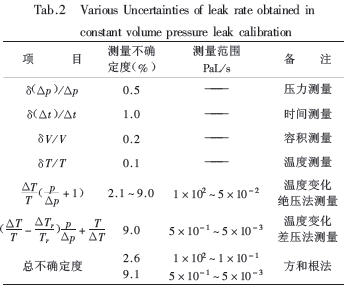 在实际测量中,总有温度波动存在,式(5)中的最后一项对不确定度的贡献最大。若要减小这一项不确定度,应尽量增大△p,减小△t 和△Tr。表2中列出了定容法校准正压漏孔漏率的各项不确定度。