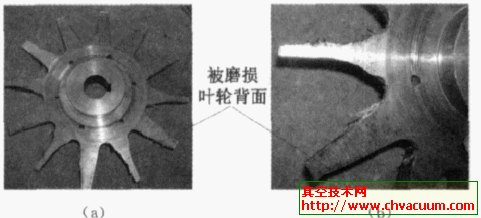 甲醇装置碳四泵(位号P2202A/B)的体积流量28m3/h ,扬程243m ,配套电机功率为45kW/台。该泵在运行2~8h后,后轴承发生严重磨损,后止推轴承碎裂,首级叶轮叶片与泵体前盖、次级叶轮背面与泵体组件都发生磨损。叶轮损坏的示意图见图2 。