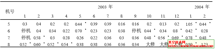 2003年及2004年1、2月份徐州发电厂5~8号机组真空严密性的检测结果见表1: