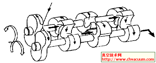 图3 爪型泵的运作道理沿轴向逆流少,如图4所示。因此在高压区它的压缩比,比罗茨泵的压缩比高,如图5所示。