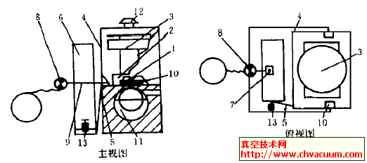 当前的通常油封式旋片真空系统泵的油从排气管阀废料后又继续进行的迈入到泵腔, 当泵进行时, 油易于返入泵腔从而造成接下来启动时很困难和油道淤塞, 非常是当油被被抽媒介弄脏后进行的迈入到泵腔, 一种问题就更难治了。所以, 被弄脏的油进行的加入上班亦会作用泵的安全性能。因为, 人们在油嵌套循环成分上进心行了重大安全事故改善。改善后的成分示意愿图如图所示1。 图1 中油将沿以上各线路参予本职工作: 油与被抽有机溶剂→排气阀阀阀1→小机水箱2→提取式排气阀阀帽3→主进气软管4→回进气软管5→副机水箱6→进行全自动过滤器7→阀8→进进气软管9→分油腔10→轴承端盖、泵腔11从排气阀排出的被抽介质和油经过分离式排气帽时, 气体和一部分蒸汽由排气口12 排出, 灰尘、杂质及被污染的油沉入主油箱底部后, 通过回油管流入副油箱; 经过分离、沉淀, 乳化后油、水、灰尘杂质沉入副油箱底部由排放阀13 定期放出, 而相对干净的油则由设于副油箱中上部的过滤器过滤后进入与泵联动的阀门, 再经进油管进入分油腔后供给端盖和泵腔工作。阀门与泵联动, 即泵工作时, 阀门启动, 油路口打开充气口关闭; 泵停止时,阀门油路口关闭, 同时充气口打开, 大气从进气口经进油管向泵腔充气而破坏泵腔内真空, 使泵油无法进入泵腔。