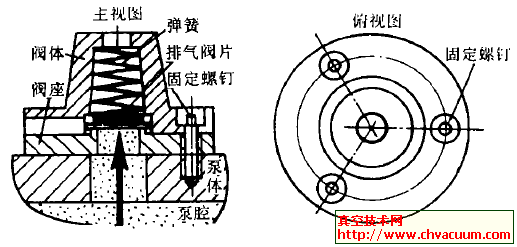 总数的排气阀门阀平常用于如2 或图3 图示框架。 图2 基本上的泄压阀阀成分图a 这两设计更大的问题是: a 当泵常年抽除直流高压强有害气体时, 图2、3 中的酚醛母线和弹簧片钢片多次地处极根弯矩状态下, 很便捷出现形变损失应力松弛或是脱落。而图2 中的耐酸碱聚氨酯阀片也非常轻易被被抽导电物质锈蚀出现形变和影响受损; b出排的导电物质目的于泄压阀阀片上偏斜阀特定螺丝, 多次频次的弯矩极根挑战, 很便捷使螺丝松脱。这样子, 不光引发泵稳定性上升和维修保养率增大,而泵油非常轻易从泄压阀口跳回入泵腔, 影响开机启动困难的。 图3 普通的泄压阀阀形式图b通过改进后的排气阀结构如图4, 共设两组。一组为高弹簧力的大排气阀, 供大气压~103Pa 压强范围内与小排气阀一起排气; 另一组为低弹簧力的小排气阀供当压强低于103Pa 时排气, 以降低极限压强。从排气阀结构图可看出, 从泵腔排出的被抽介质作用在金属排气阀片的作用力是均匀的, 且阀片的行程被阀体限制。因此, 经过特殊热处理的排气阀片的有效使用期将远远超过图2、3 中所示的排气阀片。同时, 排气阀片与排气阀座的接触面均经过特殊加工, 在弹簧预紧力的作用下, 其对油的密封性是非常好的。而且, 作用在排气阀固定螺栓上的作用力是对称的, 螺栓松动的可能性很小。