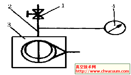 1 试验检测和解剖学介绍 1.1 经过多次实验发现我们进行的试验是空载试验, 试验、测试图如图1。试验、测试过程: 关闭充气阀(1), 接入热偶式真空计(4); 开泵(3)运行1h,使泵油温正常,读出热偶计读数(小格数)作为泵的极限全压力(小格数)然后停泵并充入大气; 5min 后, 关闭充气阀, 开泵并同时计时1min, 分段记录热偶计读数(小格数) , 见记录表1。
