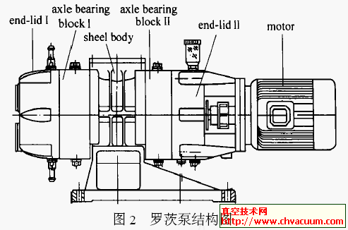 驱动电机通过一梅花形联轴器与转子I 连接,电机以悬臂形式外挂在端盖Ⅱ的联轴器支架上。一对支脚固定在泵的壳体上,并通过支座安装在机架上。端盖、壳体、转子和轴承座全部为铸铁件,壳体上方正中为进气口,与被抽系统相连,下方为排气口,与前级真空泵相接。罗茨泵工作时,在泵腔内的,二个相互垂直的“8”字形的转子由传动比为1 的一对斜齿轮带动作反向同步高速旋转,被抽气体从进气口吸入到转子与泵壳之间的封闭空间内,再经排气口排出。泵体的外表面由5个部件组成一上、下表面近似于平面,两侧为半圆面的全封闭曲面。