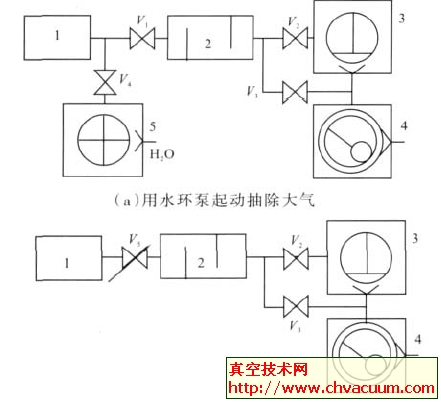 (b)用能调孔板或高压阀门操控系统性再启动时抽速1. 被抽容器 2. 过滤器 3. 罗茨泵 4. 滑阀泵 5. 水环泵 V1~V4.阀门 V5.可调阀门