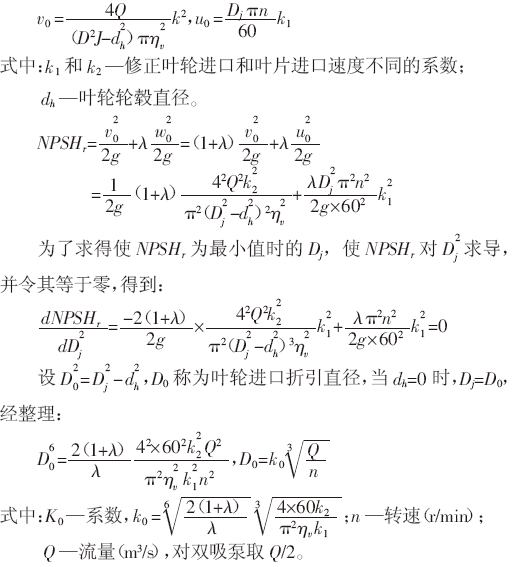 泵汽蚀裕量: 式中:v0—嫩叶原装国外稍前的或然高时间;w0—嫩叶原装国外稍前的比较高时间;λ—嫩叶口压降弹性系数。 要确认增大NPSHr 值来提高自己泵本来的抗汽蚀性能指标,则肯定确认增大v0、w0、λ 来满足,在现场改装过程中中,确认改善水泵叶轮出口直径不低于Dj和改善嫩叶出口角β1来达成该依据。 3.3.1、提高水轮进出口的直径DJ设叶片进口圆周分速度VUI=0,由叶片进口稍前的速度三角形w02=v02+u02 ,有增大叶轮进口直径DJ,则圆周速度u0增大、V0减小,必存在一个DJ使二者平方和最小。现利用求导数方法求Dj: