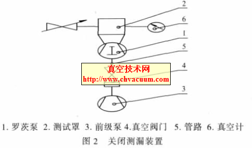 3.1、关机测漏法 (a) 測試装备测试装置由罗茨泵、测试罩、前级泵、真空阀门、管路和真空计组成。