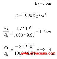 例2-2用清水测定一台离心泵的主要性能参数。实验中测得流量为10m3/h,泵出口处压力表的读数为0.17MPa(表压),入口处真空表的读数为-0.021Mpa,轴功率为1.07KW,电动机的转速为2900r/min,真空表测压点与压力表测压点的垂直距离为0.2m。试计算此在实验点下的扬程和效率。