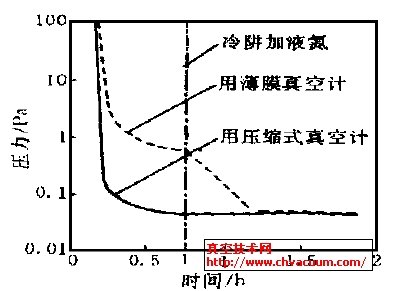 用本测试装置对2XZ22 旋片真空泵的极限真空度进行了实测也表明能够替代压缩式真空计。当冷阱未加液氮时, 用薄膜式真空计测得的结果要比用压缩式真空计高一个量级左右, 而在冷阱中加入液氮后, 经过约半小时的稳定时间, 其测得的结果与用压缩式真空计测得的结果在允许的误差范围内相一致。图2 为一组用压缩式真空计和薄膜真空计测量2XZ-2旋片式真空泵极限真空度的曲线。