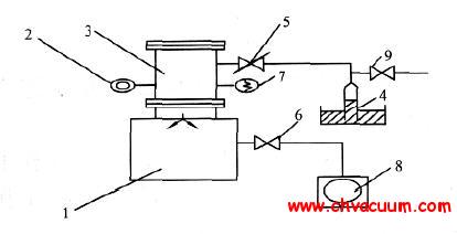 1. 分子/ 增压泵( MBP 200) 2. 冷阴极电离规3. 抽速测试罩4. 滴管式流量计5. 微调送气阀6. 隔断阀7. 皮拉尼规8. 二极旋片直联机械泵( 8 L/s) 9. 阀门