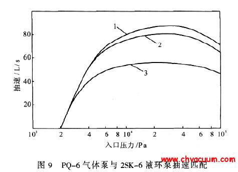 目前气体泵的极限压力水平不高, 差的只达到1.3×103 Pa, 好的也只有( 5~6) ×102 Pa。我们认为关键在于液环泵与气体泵的抽速配比是否合适, 配比不合理, 会破坏气体泵的工作, 使极限压力升高, 甚至使气体泵失去作用。曾在PQ- 6 气体泵与2SK- 6 液环泵组合上作过抽速配比对气体泵极限压力影响的试验。在液环泵进口按装一个阀门, 以调节液环泵的抽速。曲线1 为气体泵极限压力最低时( 3 . 6 × 102 Pa) 液环泵的抽速曲线, 抽速低于曲线1 时, 气体泵极限压力会上升( 稳定) , 抽速下降到曲线2 时, 气体泵极限压力产生波动( 1 . 25 × 103 Pa ~ 1 . 34 × 103 Pa) , 直至抽速降到曲线3 时波动才停止, 但这时气体泵的极限压力已跌至2 . 68 × 103 Pa , 说明气体泵已完全失去作用, 并反而因喷嘴有驱动气体进入而影响液环泵的工作。