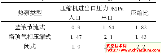 塔顶压缩式热泵无工质节流能量损耗,表4是各种类型热泵压缩机的压缩比及功耗,可以看出塔顶气相压缩式热泵压缩比最小,该类型热泵无循环工质节流的能量损失,其余二者均要节流到低压,以满足冷凝器的温度要求。闭式热泵压缩比系三者中最大的,其压缩机功耗最大也不足为奇了。