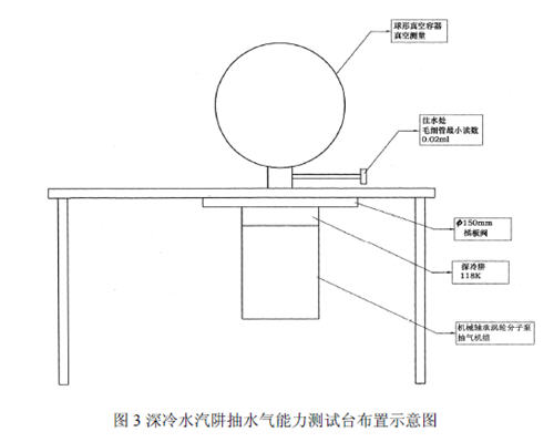 深冷水汽阱抽水汽能力测试台的布置示意图见图3。从图3 可知,深冷水气阱和分子泵处于插板阀之下,真空容器暴露大气时,深冷水气阱仍在真空中,这样的布置适用于连续生产綫的进、岀料室(装料锁)。在組合泵右上方设置了注水装置,通过一块厚橡皮,由針筒注入定量的水。