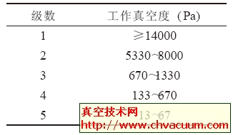 蒸汽喷射真空泵是利用流体流动时的静压能与动能相互转换的气体动力学原理来形成真空。具有一定压力的水蒸汽通过拉瓦尔喷嘴喉径时达到声速, 到喷嘴的扩散部时,静压能全部转化为动能, 达到超声速, 同时喷嘴出口处形成真空, 被抽气体在压差的作用下, 被抽入吸入室, 和蒸汽一边混合一边进入文丘里管, 然后以亚声速从文丘里的扩散管排出, 同时混合的气体速度逐渐降低, 压力随之升高, 而后从排出口排出。如果将几个喷射泵串联起来使用,泵与泵中间加入冷凝器使蒸汽冷凝, 便可得到更高的真空度。一般工作真空度与级数的关系如下:
