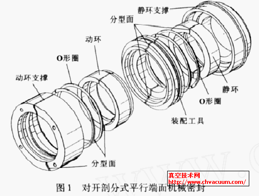 机械密封作为一种旋转轴动密封, 因结构简单和性能稳定, 被广泛应用于电力、船舶、航空航天、石油化工等领域的装置上。人们通过改进密封端面结构, 改变摩擦副组对材料, 加强冲洗、冷却等力图延长机械密封寿命。然而, 工作条件不同和环境变化,以及工作过程中动、静环密封端面间存在着的摩擦磨损(对于非接触式机械密封, 在开停车阶段或介质参数发生变化时, 也存在摩擦磨损) , 在造成端面或其他零部件损坏, 引起泄漏率超标后, 终将导致停机修理或更换机械密封。由于穿套在旋转轴上的机械密封, 其基体包括密封环和辅助密封圈的形状是闭合环形, 拆卸修理或更换时需要卸下轴一端的配合件, 工程量大、时间长、费用高。真空技术网有关文章表明, 机器设备维修中有40%~50%的工作量用于轴封的维修,大约有70%的维修费用于处理相关机器的密封故障。