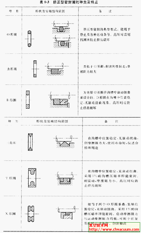 O形圈是挤压型密封的典型结构形式(见表8-3),在各种挤压型密封中,它的应用最广。