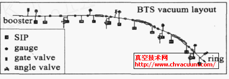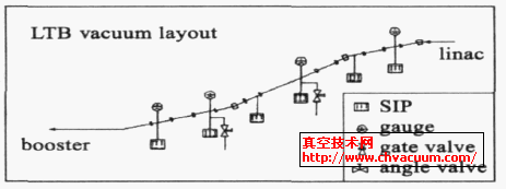 输运线真空室残余气体主要是H2 、CO、H2O、N2和CO2 ,对于惰性气体含量没有特别的要求,因此在高、低能输运线上主泵系统全部采用二极溅射离子泵(SIP) ,其完全无油、无震动、大抽速和高极限真空度的特点非常适合同步辐射光源的真空环境。由于传输束流在输运线上没有阻抗要求,因此离子泵全部采用大直径圆筒的泵站结构安装,减少有效抽速的损失。在避开特殊部件如磁铁和某些对位置要求严格的束测元件(如光束狭缝) 的基础上,离子泵的位置按照一定间距排布,尽量使得输运线的压强分布均匀。输运线要求整段压强小于2 ×10 - 5 Pa ,储存环的静态压强要求小于2.6 ×10 -8 Pa ,因此在靠近储存环注入区域,高能输运线的真空系统设计要适当增加抽速,使得这里的压强接近储存环的压强要求。真空压强测量选用宽线性量程的B-A 规。图2 和图3 是输运线真空元件布局图。