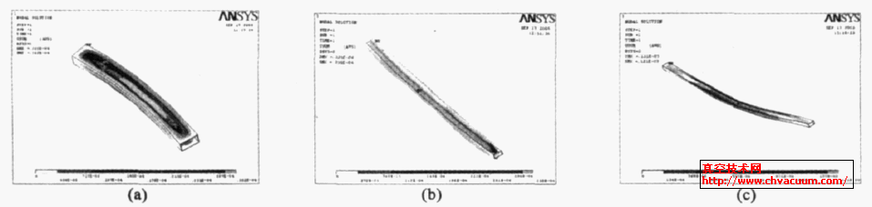 输运线四极铁区城的束流清新区是椭弧形形包络,二极铁区城的束流清新区是椭弧形包络,由于直段区城的重力作用盒是椭弧形形断面,弯段区城的重力作用盒是四边形断面。表1 是高、低能输运线镊子的粒径、清新区各种重力作用盒尺寸。 表1 输运线的强力磁铁外径、精准区与正空盒大小由于真空盒抽真空后,盒体表面上承受的大气压力导致其发生向内的凹陷变形,盒体的厚度必须保证变形后的盒体与束流清晰区仍然有足够的间距。我们用有限元数值计算方法分析了高、低能输运线弯段真空盒的变形情况,计算采用ANSYS810结构分析软件包,直接在ANSYS 程序中建立真空盒模型,材料的弹性模量200 GPa ,泊松比0.3。固定长度方向的两个端面,其余4 个外表面施加1.0 ×105 Pa 的压力,计算结果见图4 (a) ,4 (b) ,另外由于高能输运线弯段真空室长度达到2.2 m ,因此考虑了高能线弯段真空室在自重作用和真空负载双重作用下的变形,结果见图4 (c) 。
