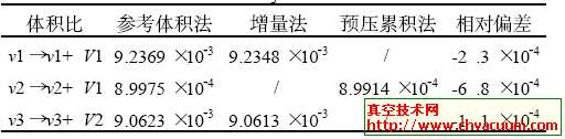 为了验证体积比测量的准确性,也为了找出大体积可能的系统差,我们对目前常用的累积法做了改进。由于累积法每次测量耗时长,且前10次膨胀不计入,所以我们提出了增量法和预压累积法,分别对1∶100和1∶1000的体积比进行了复测,测量结果如表2 所示。
