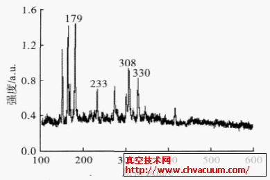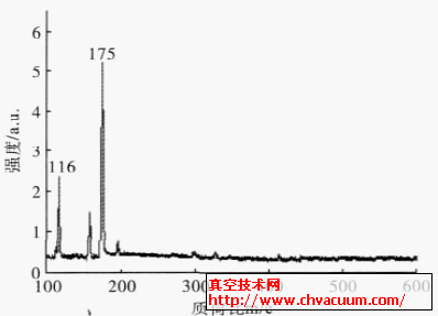 在离子阱前端盖处可检测到大于50×10-12A的离子流,证明了整个真空系统具有较好的去溶效果和较高的离子传输效率,达到了离子阱质量分析器所要求的工作条件。应用研制的ESI 离子阱质谱仪样机对一些简单的有机物进行了初步测试,图5 为精氨酸的质谱图,图6 为谷光甘肽的质谱图, 质谱峰位和根据分子结构式推断出的峰位完全一致。通过这些测试可以确认该离子阱质谱仪样机的质量范围已经达到质荷比600, 分辨率优于300。这也证明了真空系统设计符合该ESI 质谱仪的设计要求。